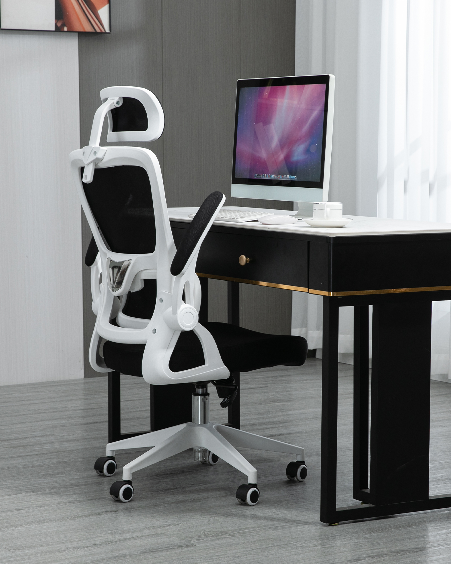 • Ghế văn phòng này tự hào có một bảng màu trắng và đen nổi bật, với một thiết kế độc đáo bổ sung cho bất kỳ trang trí văn phòng hiện đại nào. Được trang bị tay vịn có thể điều chỉnh, chiếc ghế này cho phép bạn tùy chỉnh vị trí của cánh tay để có được sự thoải mái tối ưu. Tay vịn có thể được di chuyển lên hoặc xuống, và cũng có thể được điều chỉnh theo góc hướng vào trong hoặc ra ngoài, đảm bảo rằng cánh tay của bạn được hỗ trợ ở vị trí tự nhiên nhất.